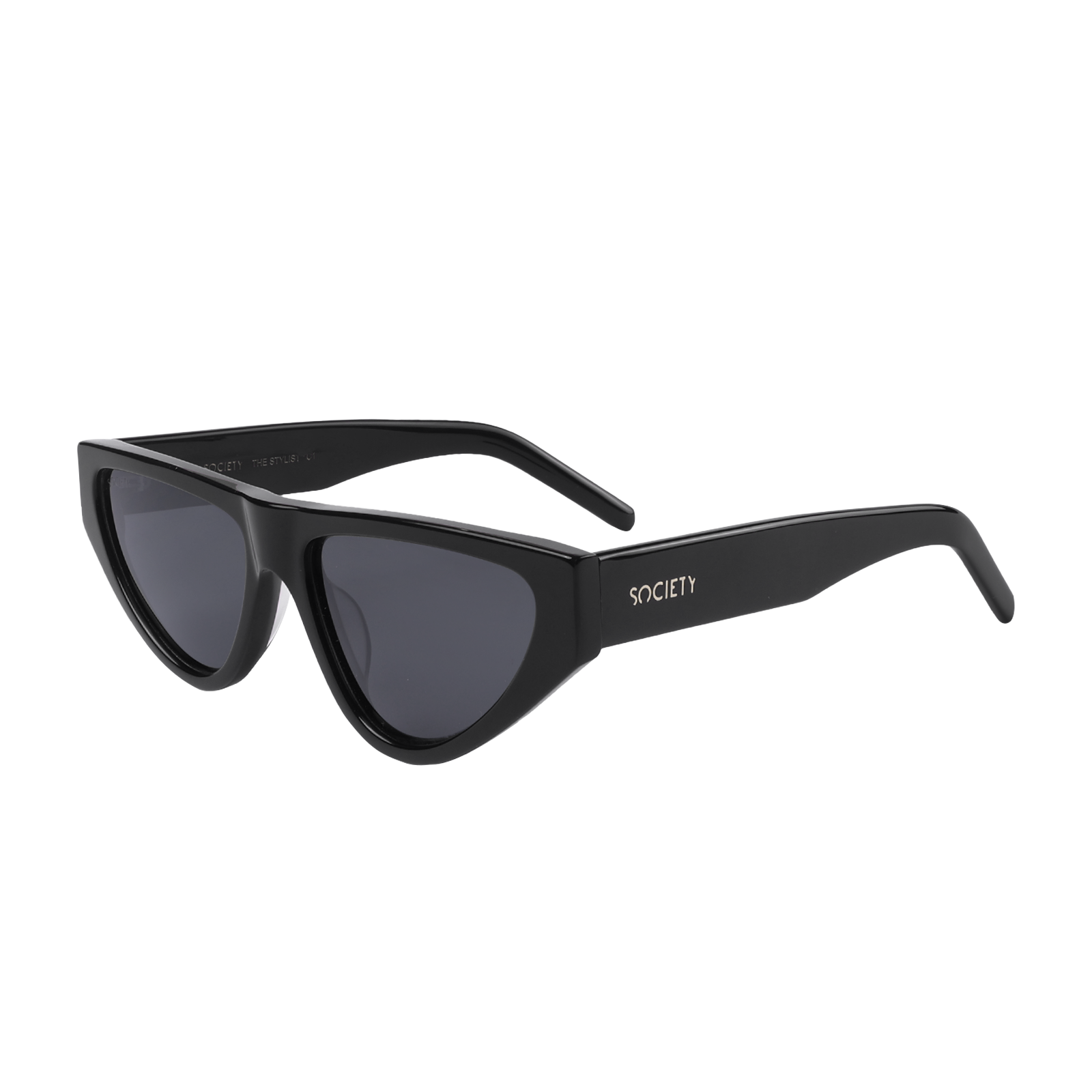 Where vintage meets vision. The Stylist in C1 channels a bold, retro-inspired cat-eye silhouette for a timeless yet edgy statement. Featuring a smooth black acetate frame and dark gradient lenses, it flatters every face shape with its sharp lines and attitude. The gold Society logo on the temples adds just the right touch of elegance.